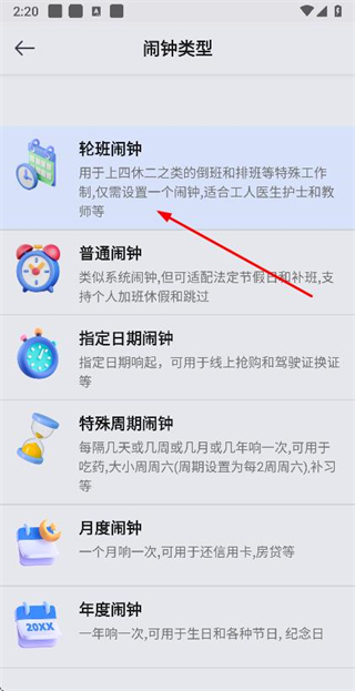 2、在鬧鐘類型選擇頁面點擊輪班鬧鐘選項,進入添加輪班鬧鐘頁面。