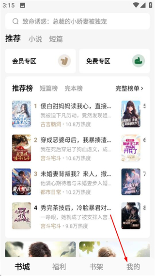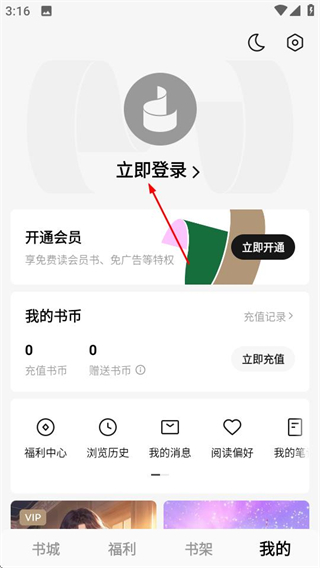 1、在紅燭小說書城頁(yè)面,點(diǎn)擊底部的我的選項(xiàng),進(jìn)入個(gè)人中心頁(yè)面。