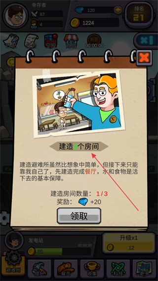 1、點(diǎn)擊領(lǐng)取獲取建造房間的獎(jiǎng)勵(lì),推進(jìn)避難所建造任務(wù)。