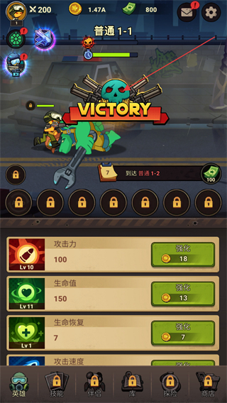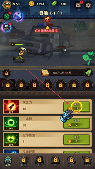 2、在普通1-1關卡界面,按指引點擊強化按鈕提升攻擊力,助力完成攻擊力達到1/5級的目標。