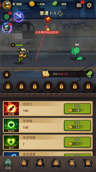 3、處于普通1-1界面,完成屬性強化后,點擊重新挑戰(zhàn)首領按鈕推進戰(zhàn)斗,以此達成到達普通1-2的任務要求。