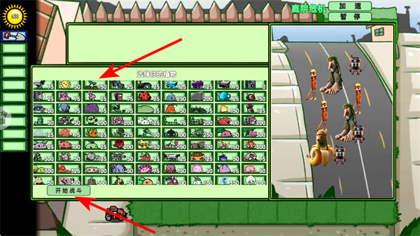 2、在植物選擇界面中,選定需要的植物并點擊下方按鈕,這是配置戰(zhàn)斗陣容的基礎(chǔ)操作,操作后會進入實際的戰(zhàn)斗場景。