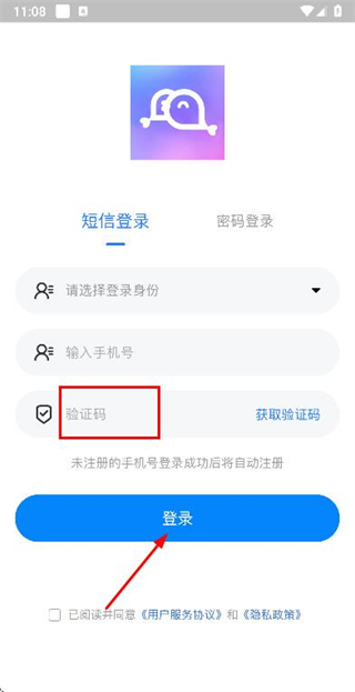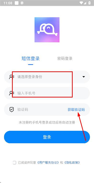 2、在手機(jī)登錄頁面選擇身份輸入手機(jī)號,勾選協(xié)議后,點(diǎn)擊獲取驗(yàn)證碼。