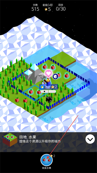 3、在資源管理界面,根據(jù)提示提煉資源升級(jí)城市,點(diǎn)擊收獲水果按鈕,獲取水果資源,為城市升級(jí)積累素材。
