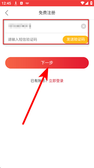 2、在注冊頁面,輸入手機(jī)號,點擊發(fā)送驗證碼后填入收到的短信驗證碼,再點擊下一步。