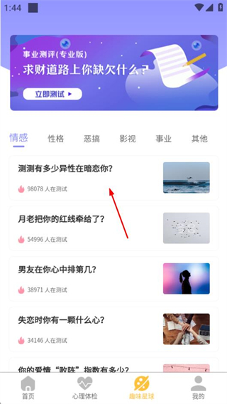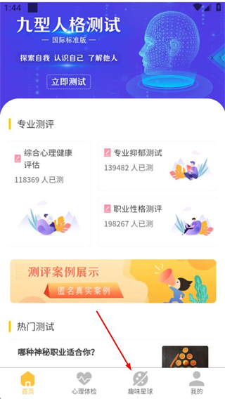 1、在抑郁癥焦慮癥測(cè)試首頁,點(diǎn)擊底部趣味星球選項(xiàng),進(jìn)入趣味測(cè)試分類頁面。