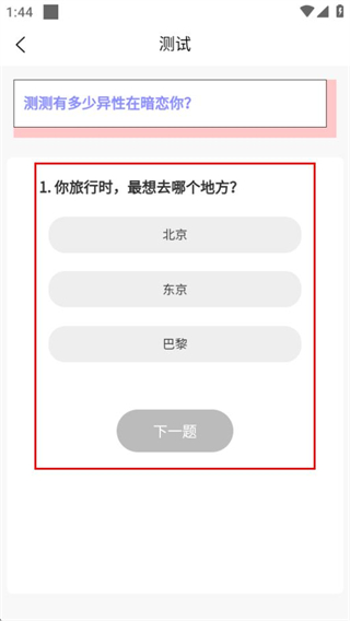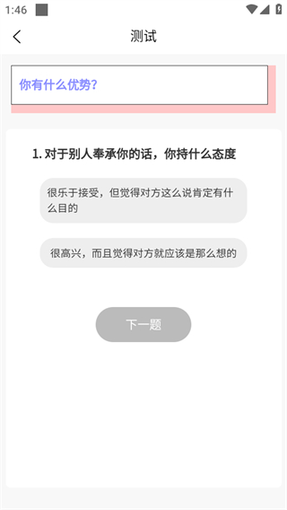 3、在測(cè)試題目頁面,選擇對(duì)應(yīng)選項(xiàng)后點(diǎn)擊下一題按鈕,推進(jìn)測(cè)試流程。