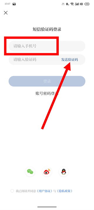 3、在短信驗(yàn)證碼登錄頁(yè)面,輸入手機(jī)號(hào),點(diǎn)擊發(fā)送驗(yàn)證碼。