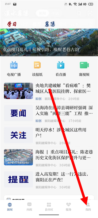 1、打開(kāi)漢水襄陽(yáng),在新聞頁(yè)面,點(diǎn)擊底部的我的,進(jìn)入個(gè)人頁(yè)面。