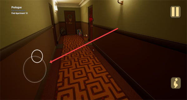 2、進(jìn)入走廊場(chǎng)景后,通過(guò)左側(cè)的虛擬搖桿控制角色移動(dòng),前往目標(biāo)區(qū)域,推進(jìn)序章的解謎進(jìn)程。