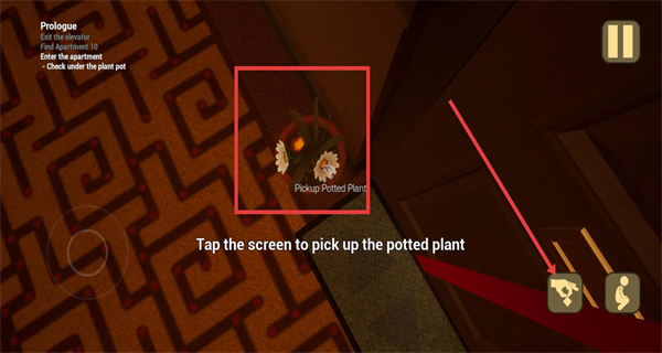 3、移動(dòng)到盆栽位置后,點(diǎn)擊屏幕拾取該盆栽,同時(shí)可查看盆栽下方的物品,獲取解謎所需的道具。