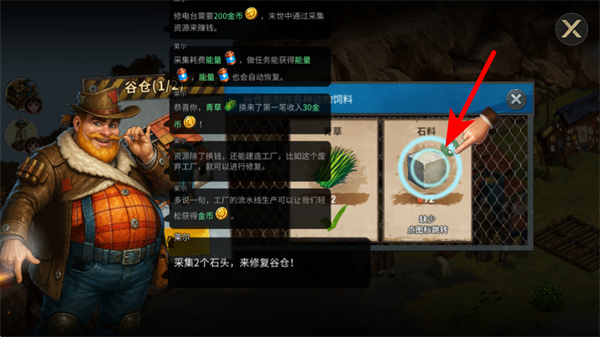 1、在任務(wù)界面點(diǎn)擊紅色箭頭指向的石料道具,可選中該道具用于后續(xù)修復(fù)谷倉的任務(wù)。