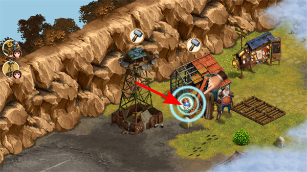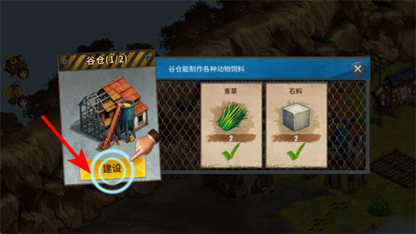 3、材料收集完成后,點(diǎn)擊紅色箭頭指向的建設(shè)按鈕,即可開始修復(fù)谷倉,推進(jìn)任務(wù)進(jìn)度。