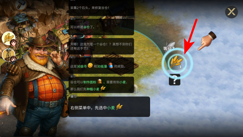 1、在任務(wù)界面點(diǎn)擊紅色箭頭指向的小麥圖標(biāo),選中該作物用于后續(xù)種植操作。