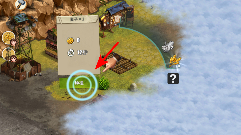 2、選中小麥后,點(diǎn)擊紅色箭頭指向的種植按鈕,即可在農(nóng)田中播種小麥,等待12秒成熟。