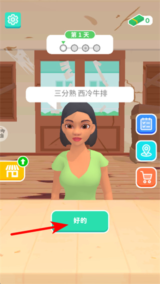 1、在顧客點單界面,點擊紅色箭頭指向的好的按鈕,確認(rèn)接收三分熟西冷牛排的訂單。