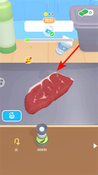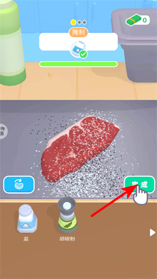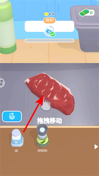 3、拖動鹽罐到紅色箭頭指向的牛排位置,為牛排撒上鹽,完成第一步調(diào)味操作。