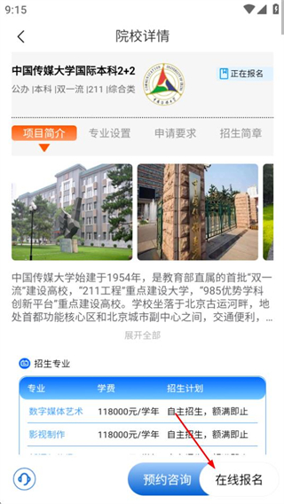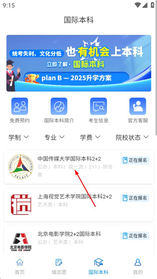 2、在國(guó)際本科頁(yè)面選擇中國(guó)傳媒大學(xué)國(guó)際本科2+2,進(jìn)入院校詳情頁(yè)面。