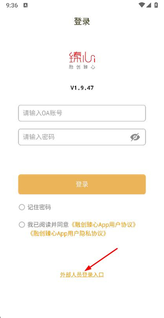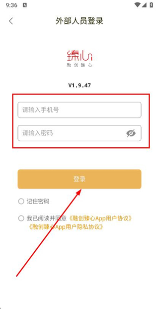 3、在外部人員登錄頁面手機(jī)號和密碼,勾選協(xié)議后,點(diǎn)擊登錄完成賬號登錄操作。