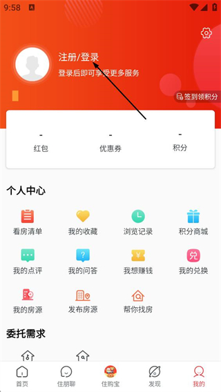 3、在我的頁(yè)面,點(diǎn)擊頂部的注冊(cè)/登錄區(qū)域,進(jìn)入登錄頁(yè)面。