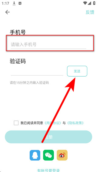 3、在注冊頁面的手機號框填寫手機號,再點擊發(fā)送獲取短信驗證碼。