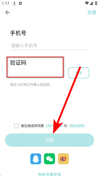 4、將收到的驗證碼填入驗證碼框,勾選相關(guān)協(xié)議后,點擊注冊完成賬號注冊。