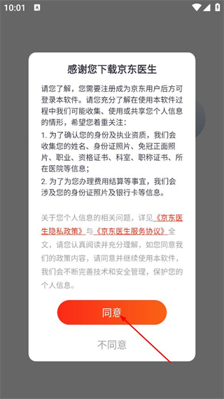 1、閱讀京東醫(yī)生隱私政策與京東醫(yī)生服務(wù)協(xié)議后,點(diǎn)擊同意,進(jìn)入應(yīng)用。