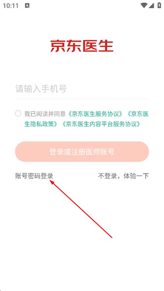 2、在京東醫(yī)生登錄頁(yè),點(diǎn)擊賬號(hào)密碼登錄選項(xiàng),進(jìn)入賬號(hào)密碼登錄頁(yè)面。