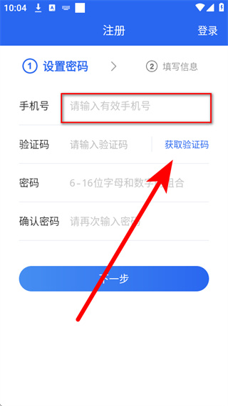 3、在注冊(cè)頁(yè)面,先填寫有效的手機(jī)號(hào),點(diǎn)擊獲取驗(yàn)證碼。