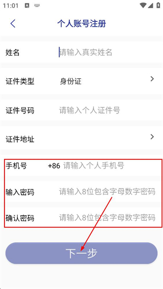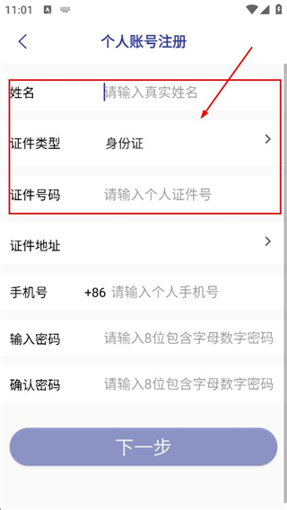 3、在個(gè)人賬號(hào)注冊頁,填寫請輸入真實(shí)姓名、請輸入個(gè)人證件號(hào)等基礎(chǔ)信息。