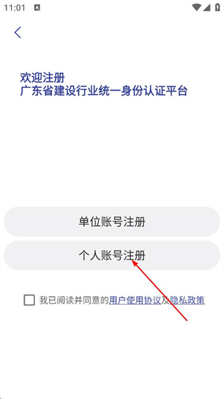 2、在注冊選擇頁,點(diǎn)擊個(gè)人賬號(hào)注冊按鈕,進(jìn)入個(gè)人賬號(hào)注冊頁面。