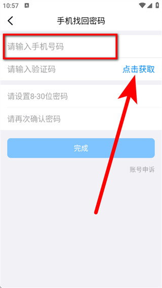 2、在手機(jī)找回密碼頁(yè)面,輸入手機(jī)號(hào)碼,點(diǎn)擊獲取驗(yàn)證碼。