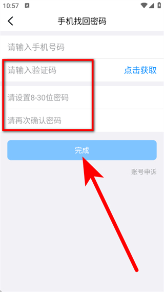 3、輸入驗(yàn)證碼,設(shè)置新密碼,點(diǎn)擊完成,完成密碼找回。