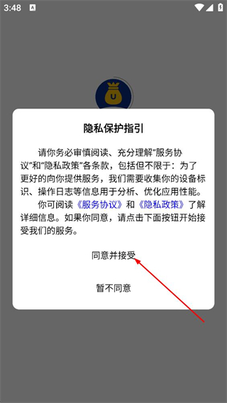 1、在隱私保護(hù)指引彈窗中,閱讀服務(wù)協(xié)議和隱私政策后,點(diǎn)擊同意,進(jìn)入應(yīng)用。