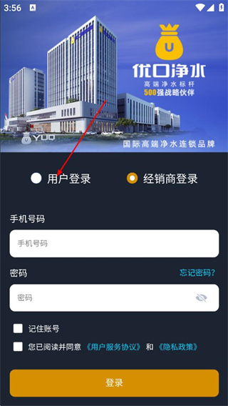 2、進(jìn)入登錄頁后,選擇經(jīng)銷商登錄選項(xiàng),切換到經(jīng)銷商類型的登錄表單。