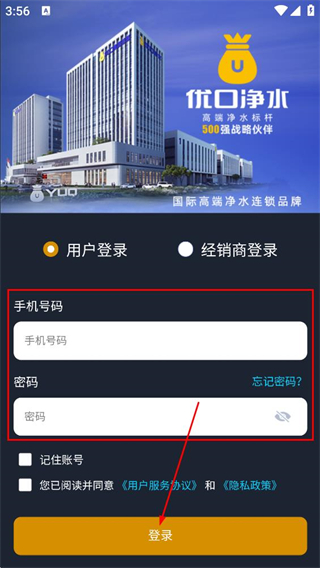 3、切換至用戶登錄選項(xiàng),在表單中填寫手機(jī)號碼和密碼,即可準(zhǔn)備登錄。