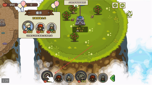 1、消耗300資源招募士兵,查看提示了解可招募的兵種及消耗。
