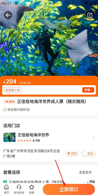 3、在商品詳情頁面點擊立即預(yù)訂按鈕,進入該門票的預(yù)訂流程。