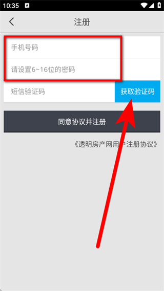 4、在注冊頁面,輸入手機號碼,設(shè)置密碼,點擊獲取驗證碼。