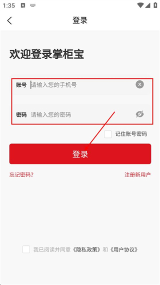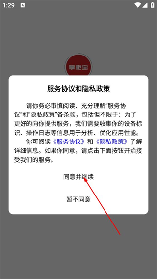 1、閱讀服務(wù)協(xié)議和隱私政策后,點擊同意,進(jìn)入掌柜寶應(yīng)用。