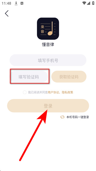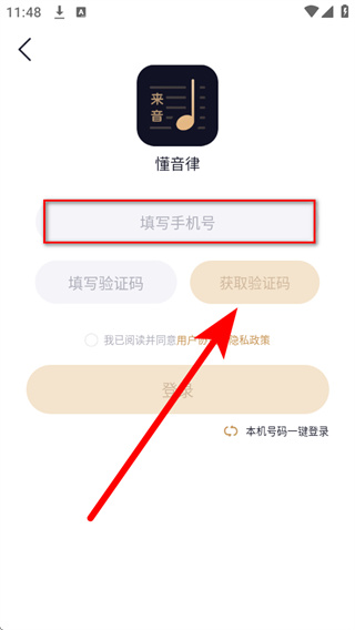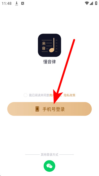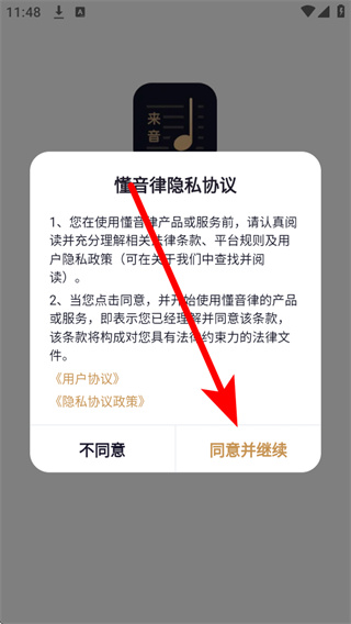 1、打開(kāi)懂音律,在彈窗中點(diǎn)擊同意并繼續(xù),進(jìn)入登錄選擇頁(yè)面。
