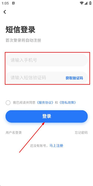3、在登錄頁(yè)面填寫(xiě)手機(jī)號(hào)和驗(yàn)證碼,勾選協(xié)議后,點(diǎn)擊登錄完成賬號(hào)登錄操作。