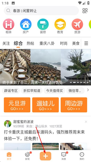 1、在重慶購(gòu)物狂首頁(yè),點(diǎn)擊底部加號(hào)可打開(kāi)發(fā)布選項(xiàng)界面。
