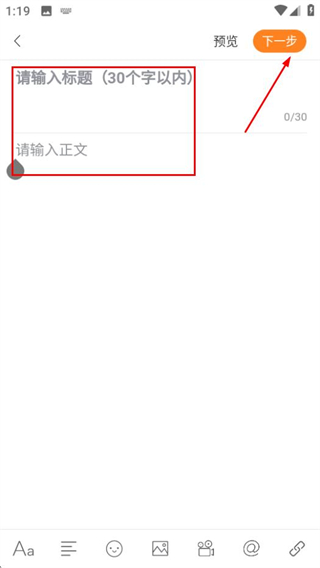 3、帖子編輯頁(yè)面填寫(xiě)標(biāo)題和正文后點(diǎn)擊下一步可進(jìn)入發(fā)布設(shè)置頁(yè)面。