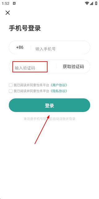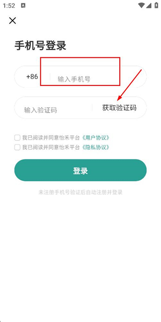 2、在登錄頁面填寫手機號,勾選協(xié)議后,點擊獲取驗證碼。