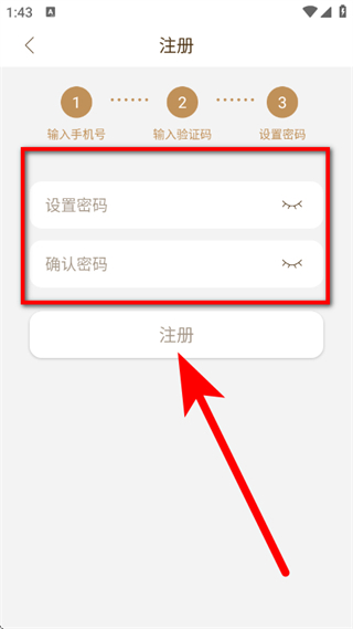 4、在注冊第三步頁面,設(shè)置密碼,點擊注冊,完成賬號注冊。