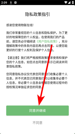 1、打開物聯(lián)在線,在頁面點(diǎn)擊同意并繼續(xù),進(jìn)入登錄注冊頁面。