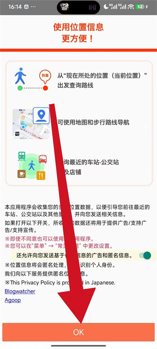 1、打開(kāi)乘換案內(nèi)后,在提示頁(yè)點(diǎn)擊底部的OK,進(jìn)入應(yīng)用主界面。