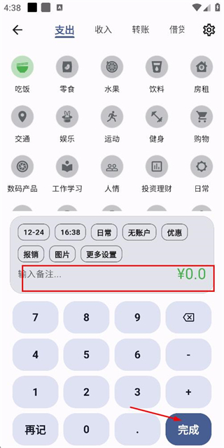 3、在頁(yè)面輸入金額并補(bǔ)充備注后,點(diǎn)擊完成按鈕保存該筆賬單。