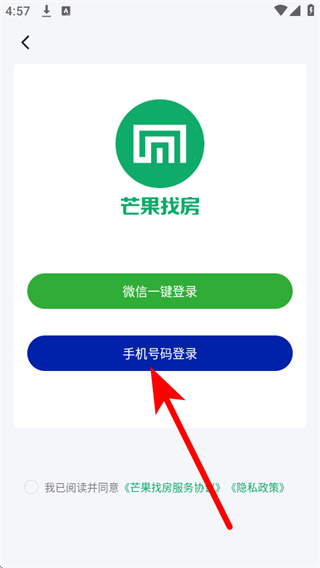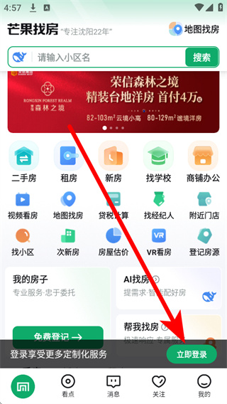 1、打開芒果找房,在首頁底部點擊立即登錄,進入登錄方式選擇頁面。